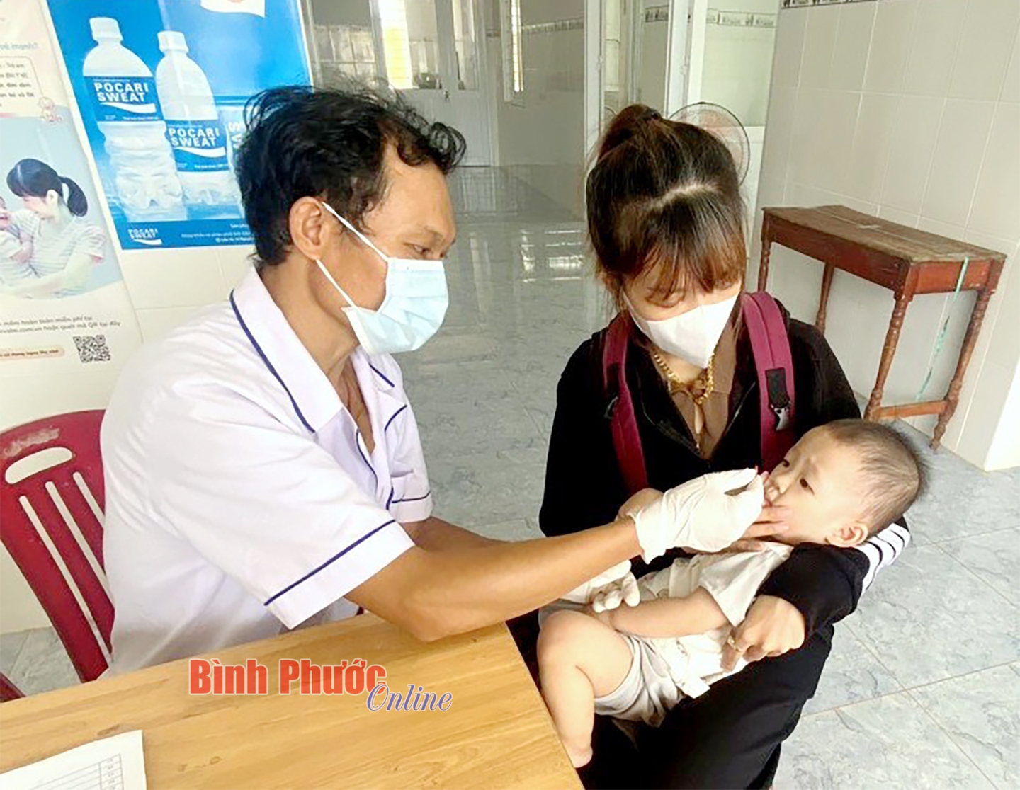 Cán bộ Trạm Y tế xã Phú Trung, huyện Phú Riềng cho trẻ uống vitamin A
