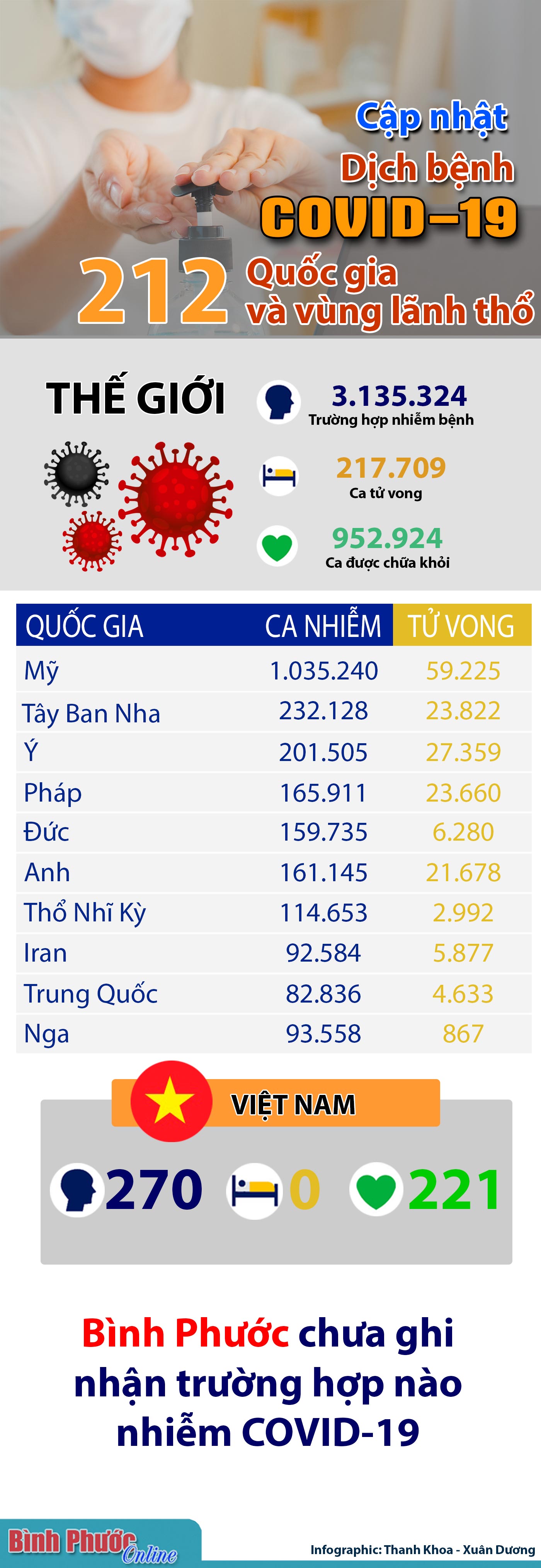 Tính đến 6 giờ ngày 29-4, Việt Nam ghi nhận 270 ca mắc Covid-19, trong đó có 130 ca nhiễm nhập cảnh được cách ly ngay. Tính từ 6 giờ sáng 16-4 đến 6 giờ sáng 29-4, Việt Nam bước sang ngày thứ 13 không có ca lây nhiễm trong cộng đồng.