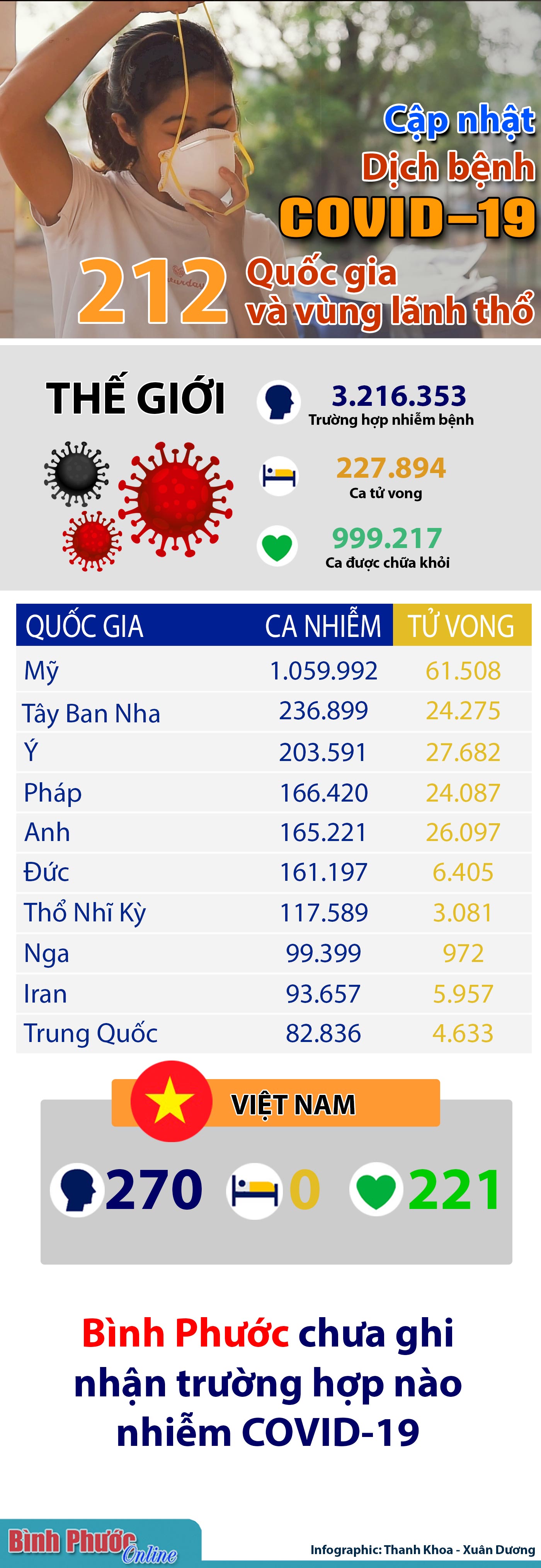 Tại Việt Nam, tính đến 6 giờ, ngày 30-4, tổng số ca mắc Covid-19 là 270 người. Số trường hợp điều trị khỏi là 219 người. Trong đó, 16 người mắc Covid-19, tính từ ngày 23-1 đến ngày 13-2, đã được chữa khỏi bệnh hoàn toàn. 203 người mắc Covid-19, tính từ ngày 6-3 đến 30-4, được chữa khỏi. Tổng số trường hợp nghi ngờ đang cách ly theo dõi là 443 trường hợp. Tổng số người tiếp xúc gần và nhập cảnh từ vùng dịch đang được theo dõi sức khoẻ (cách ly) là 34.836 trường hợp.