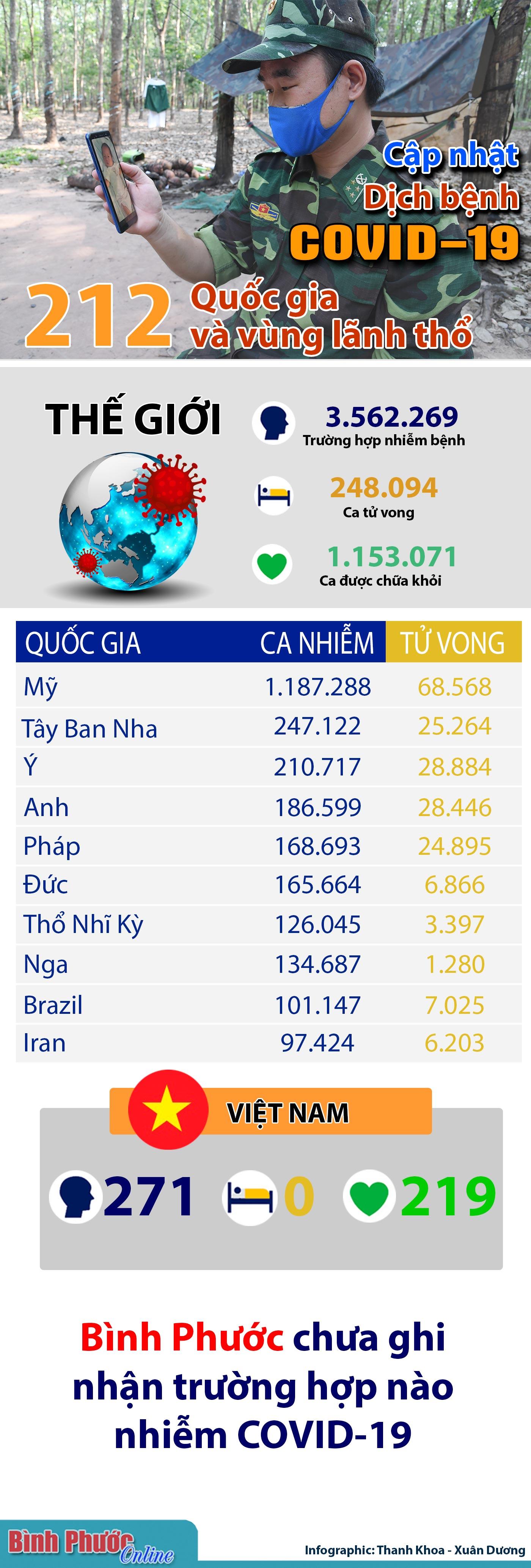 Theo trang worldometers.info, đến 6h ngày 4-5, thế giới có 3,5 triệu người dương tính với virus corona chủng mới. Tổng số ca tử vong là 248.000 người và hơn 1,1 triệu ca bệnh đã hồi phục. Việt Nam tiếp tục không ghi nhận ca nhiễm mới.