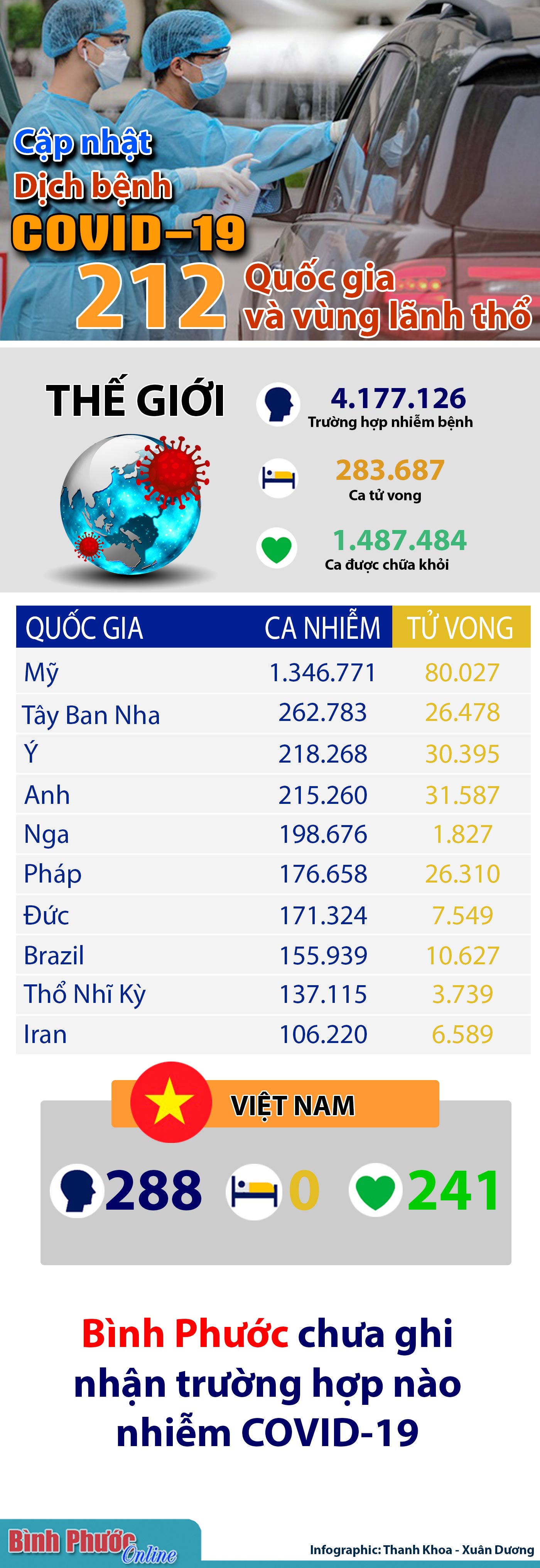 Việt Nam không ghi nhận thêm ca mới mắc Covid-19 và là ngày thứ 25 liên tiếp không có ca lây nhiễm trong cộng đồng. Đến nay, Việt Nam có 288 bệnh nhân Covid-19, trong đó có tổng cộng 148 ca nhiễm nhập cảnh được cách ly ngay.