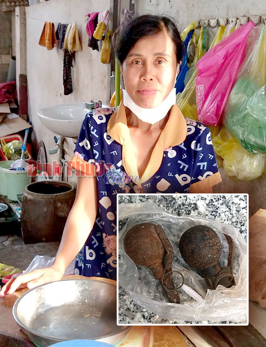 Vào sáng cùng ngày, bà Võ Thị Lệ, 51 tuổi, trú khu phố Suối Đá, phường Tân Xuân, thành phố Đồng Xoài báo tin, gia đình phát hiện trong vườn nhà có 2 vật thể giống như trái lựu đạn.