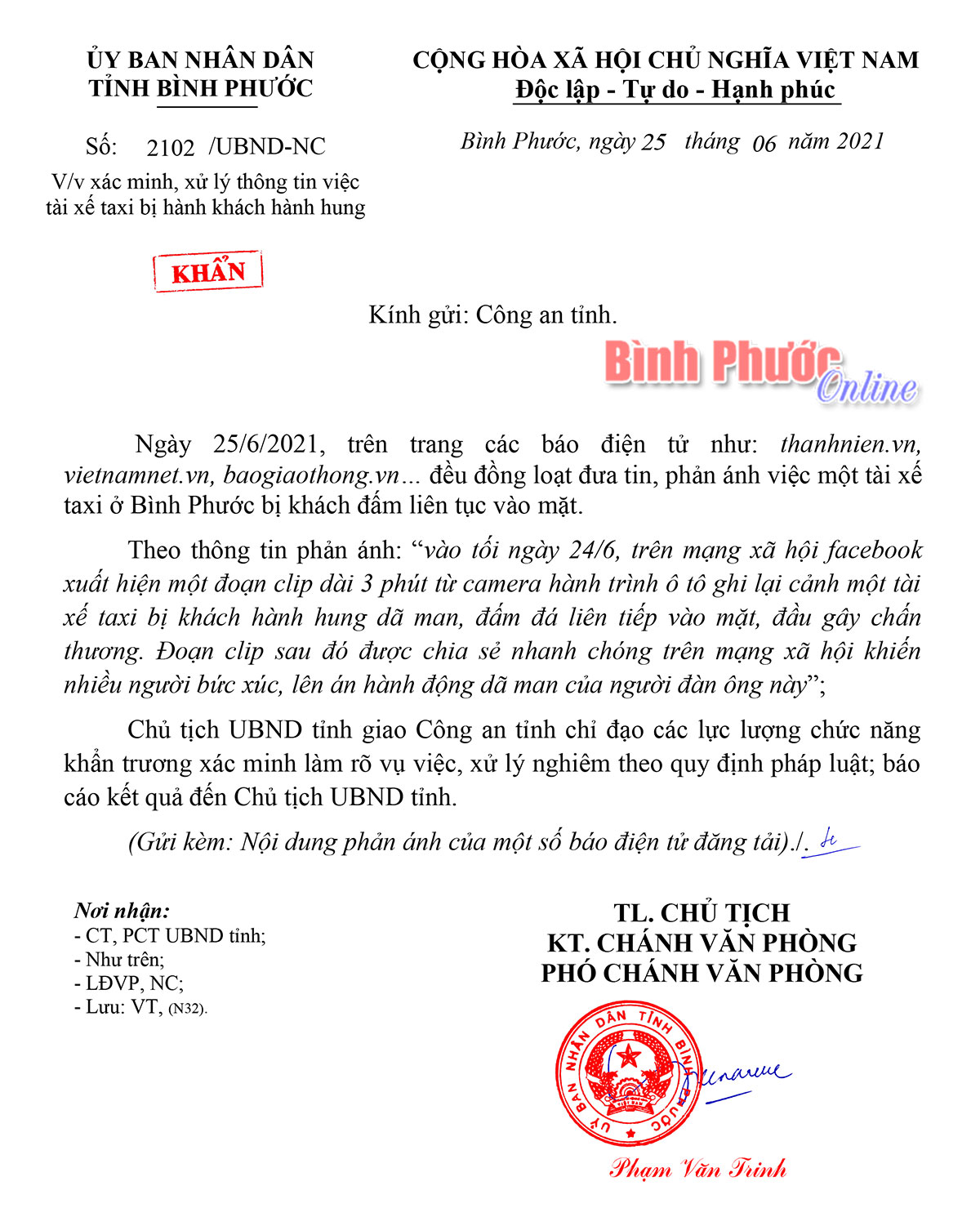 Chiều nay, 25-6, tại Công văn khẩn số 2102/UBND-NC, Chủ tịch UBND tỉnh Bình Phước đã giao Công an tỉnh chỉ đạo các lực lượng chức năng khẩn trương xác minh làm rõ vụ việc, xử lý nghiêm theo quy định pháp luật; báo cáo kết quả đến Chủ tịch UBND tỉnh.