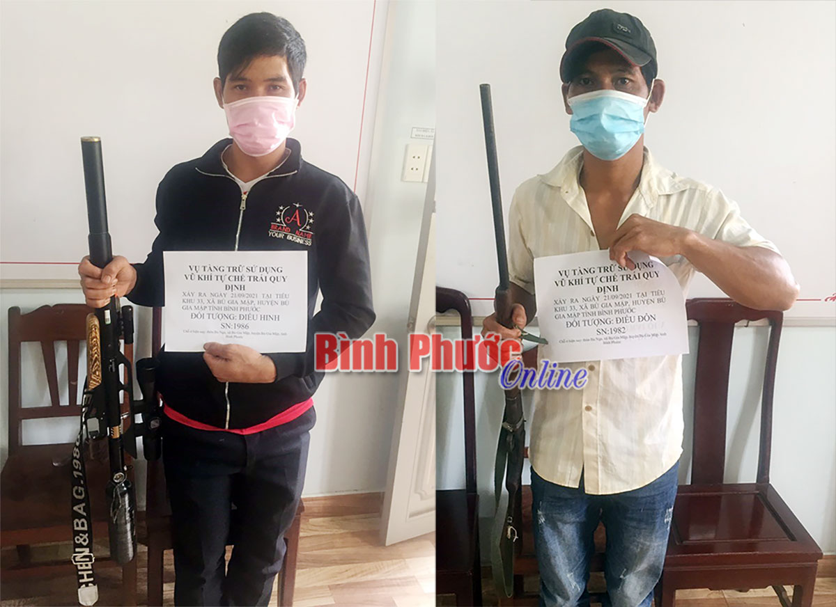 Qua kiểm tra, lực lượng chức năng phát hiện 2 đối tượng trên có mang theo 2 khẩu súng săn tự chế (1 loại súng hơi bắn đạn chì và 1 loại tự chế báng gỗ dạng súng kíp) đang trong 1 chòi gỗ ở tiểu khu 33. Ngoài ra, còn phát hiện thu giữ thêm 1 súng cồn tự chế tại chòi kế bên.