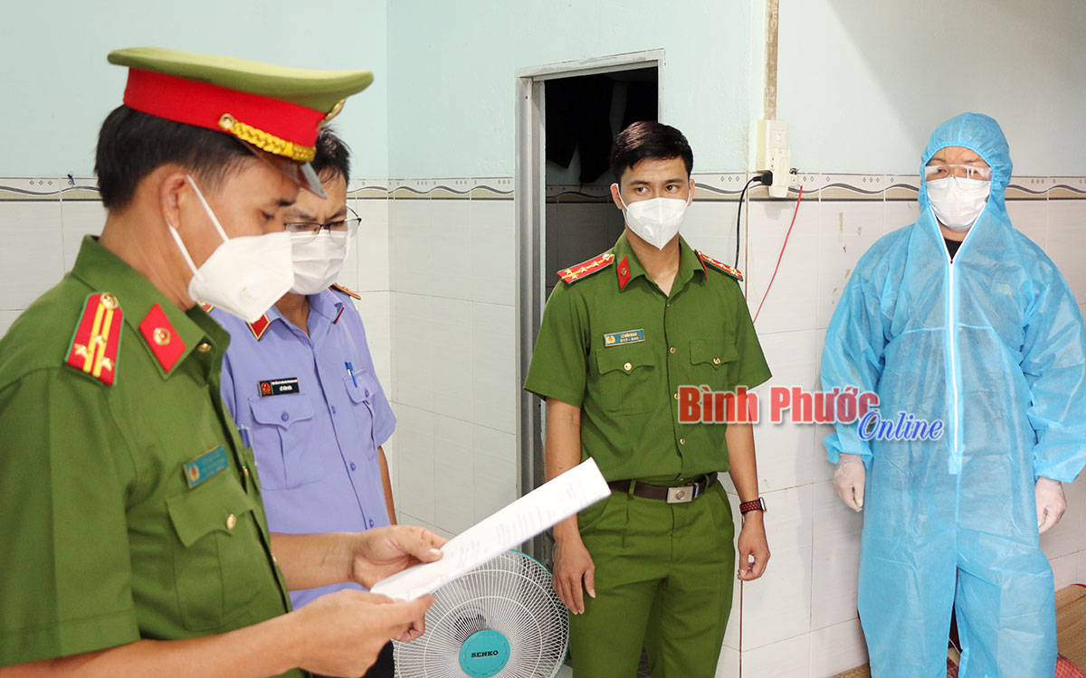 Phòng Cảnh sát kinh tế Công an tỉnh Bình Phước thi hành lệnh khám xét nơi ở của đối tượng Nguyễn Thị Thu Thảo (mặc đồ bảo hộ)