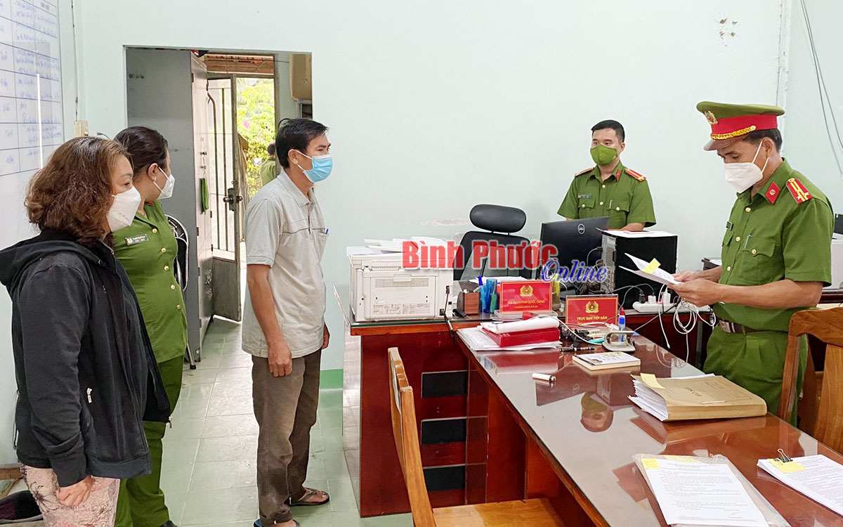 Phòng Cảnh sát kinh tế Công an tỉnh Bình Phước thi hành quyết định khởi tố bị can, lệnh bắt bị can Nguyễn Thị Thu Thảo (áo khoác đen) tại xã Vạn Phú, huyện Vạn Ninh, tỉnh Khánh Hòa