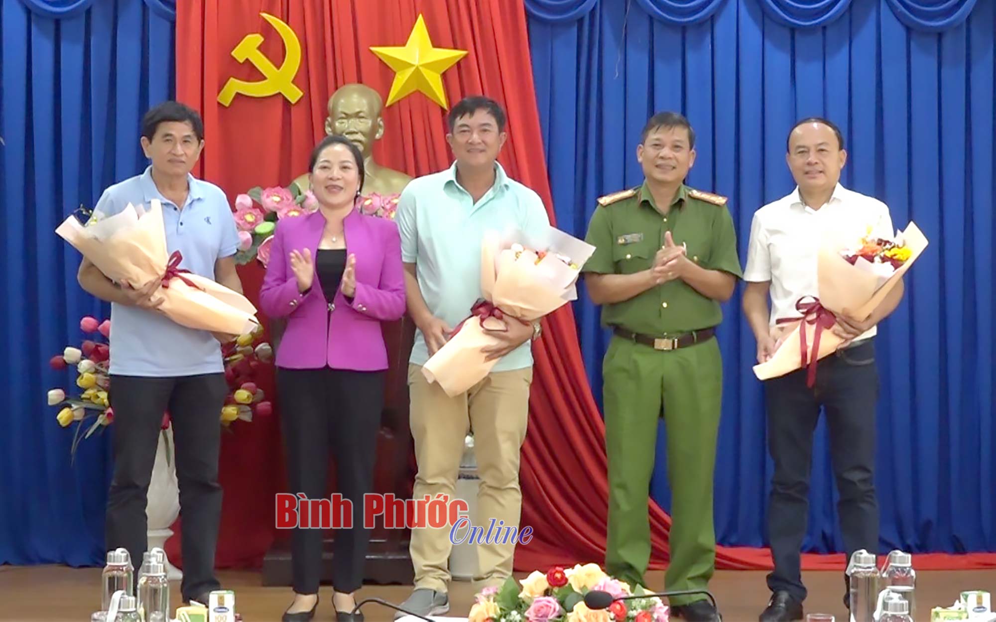 Lãnh đạo thị xã Bình Long và Công an tỉnh tặng hoa cảm ơn các doanh nghiệp hỗ trợ kinh phí trao thưởng