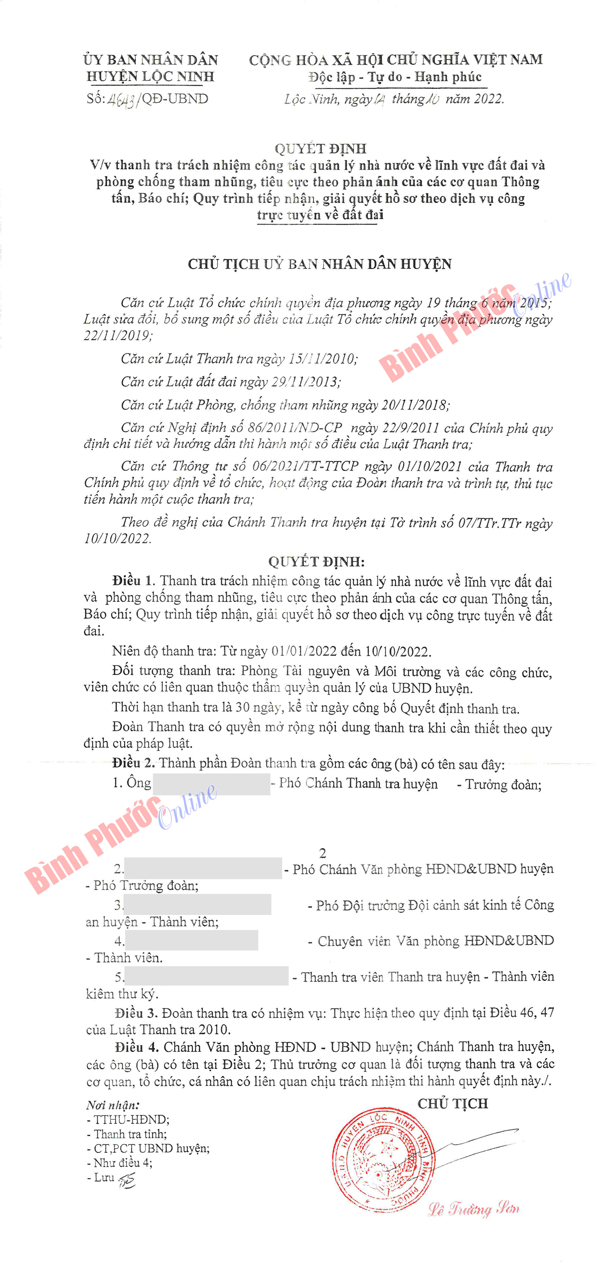 Trước các phản ánh trên, UBND huyện Lộc Ninh đã nhanh chóng chỉ đạo xử lý rất cương quyết. Cụ thể: Ngày 12-10-2022, UBND huyện đã ban hành Quyết định số 4562/QĐ-UBND thành lập Tổ giám sát việc tiếp nhận và giải quyết thủ tục hành chính tại bộ phận “tiếp nhận và trả kết quả”; cùng với đó là Quyết định số 4561/QĐ-UBND ngày 12-10-2022 của UBND huyện về việc tạm đình chỉ công tác đối với 1 công chức có liên quan đến các bài báo phản ánh để xác minh làm rõ vụ việc. Liên tiếp sau đó là Quyết định số 4643/QĐ-UBND của UBND huyện về việc thanh tra trách nhiệm công tác quản lý nhà nước về lĩnh vực đất đai và phòng, chống tham nhũng, tiêu cực theo phản ánh của các cơ quan thông tấn, báo chí; quy trình tiếp nhận, giải quyết hồ sơ theo dịch vụ công trực tuyến về đất đai. Đồng thời, UBND huyện có công văn gửi Sở Tài nguyên và Môi trường, Văn phòng ĐKĐĐ tỉnh đề nghị thanh tra trách nhiệm đối với Chi nhánh Văn phòng ĐKĐĐ huyện Lộc Ninh. Đồng thời, chỉ đạo Thanh tra huyện thành lập Tổ thanh tra trách nhiệm đối với Phòng Tài nguyên và Môi trường cũng như đề nghị Công an huyện xác minh làm rõ trách nhiệm đối với những nội dung báo chí nêu tại Chi nhánh Văn phòng ĐKĐĐ huyện Lộc Ninh…