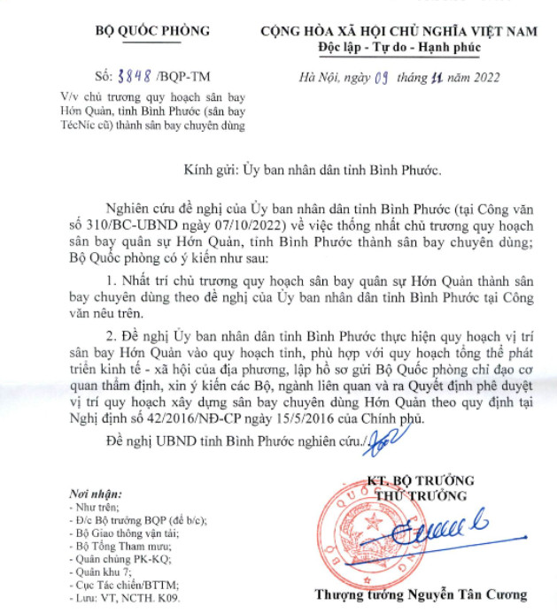 Nghiên cứu đề nghị của UBND tỉnh Bình Phước tại Công văn số 310/BC-UBND ngày 7-10-2022 về việc thống nhất chủ trương quy hoạch sân bay quân sự Hớn Quản, tỉnh Bình Phước thành sân bay chuyên dùng, Bộ Quốc phòng có ý kiến như sau: