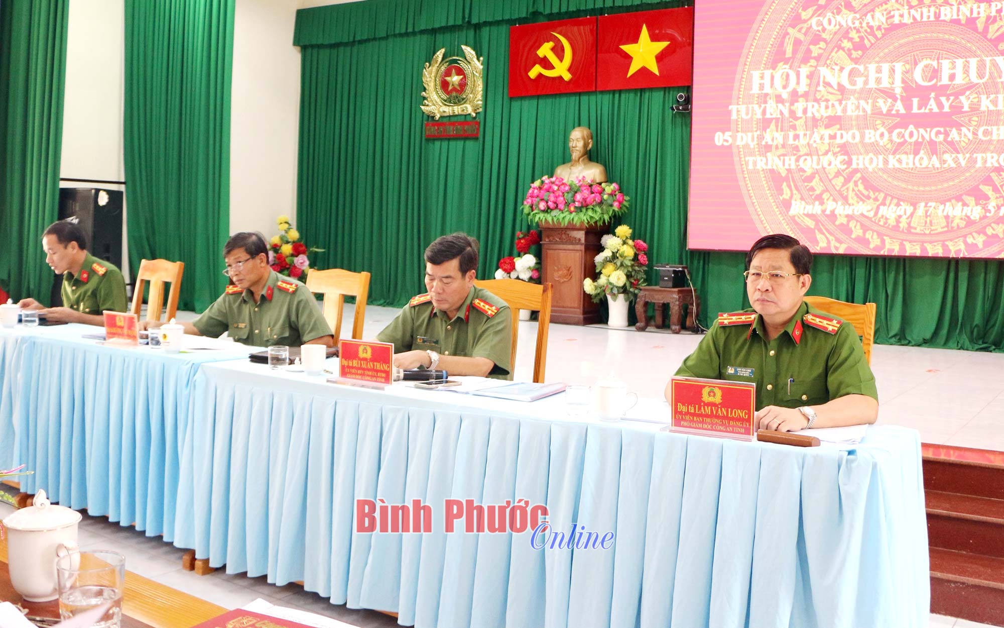 Tại hội nghị, đại biểu đã được nghe báo cáo, thông tin các nội dung trọng tâm 5 dự án luật do Bộ Công an chủ trì soạn thảo, gồm: Luật Sửa đổi, bổ sung một số điều của Luật Công an nhân dân (CAND); Luật Căn cước công dân; Luật Lực lượng tham gia bảo vệ an ninh, trật tự ở cơ sở; Luật Trật tự, an toàn giao thông đường bộ; Luật Sửa đổi, bổ sung một số điều của Luật Xuất cảnh, nhập cảnh của công dân Việt Nam và Luật Nhập cảnh, xuất cảnh, quá cảnh, cư trú của người nước ngoài tại Việt Nam.