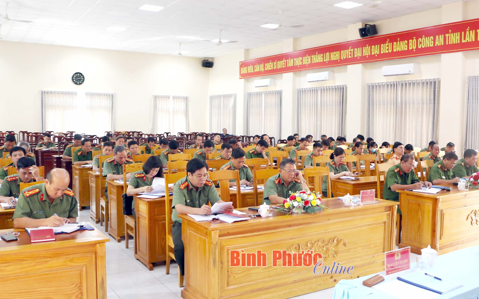 Đại tá Bùi Xuân Thắng, Ủy viên Ban Thường vụ Tỉnh ủy, Bí thư Đảng ủy, Giám đốc Công an tỉnh chủ trì hội nghị cùng các thành viên trong Ban Giám đốc Công an tỉnh