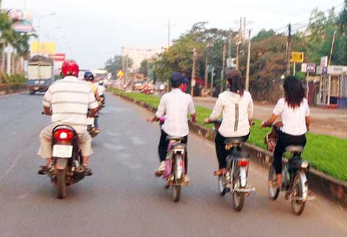 Học sinh đi xe đạp điện dàn hàng ba gây mất an toàn giao thông - Ảnh: H.L