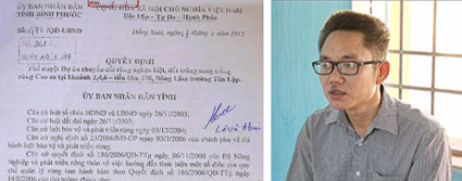 Bị can Vy Thanh Nam cùng tờ quyết định của UBND tỉnh làm giả