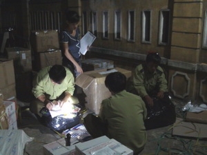 Lực lượng quản lý thị trường kiểm tra hàng hóa không rõ nguồn gốc trên xe.