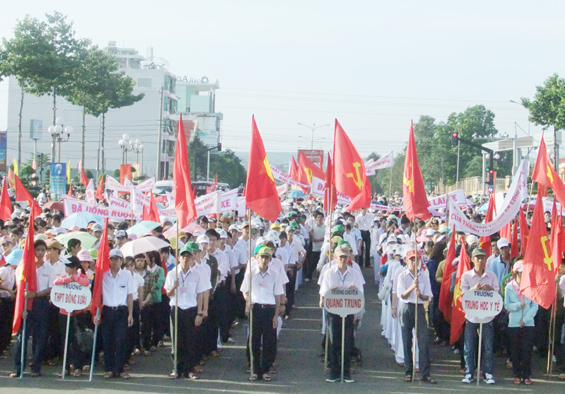 Học sinh các trường THPT, THCN và nhân dân các phường, xã trên địa bàn thị xã Đồng Xoài mít tinh thực hiện văn hóa giao thông - Ảnh: C.T