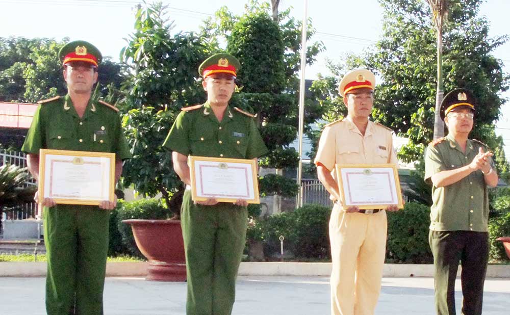 Đại tá Hoàng Văn Huệ, Giám đốc Công an tỉnh trao giấy khen cho trung tá Minh Sơn Đông và thiếu tá Nguyễn Hồng Hải (thứ nhất, thứ hai từ trái qua)