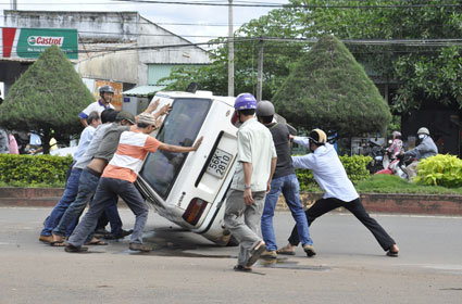 Chiếc xe đã phá gãy một trụ điện cáp điện thoại và một đoạn hàng rào Nhà máy thủy điện Thác Mơ rồi lật ngửa, củi trên xe đổ tràn khắp nơi, thùng xe hư hỏng nặng.