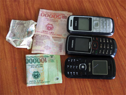 Trong lúc tiếp tục hành hung, chúng buộc hai em học sinh đưa 150 ngàn đồng và lấy luôn chiếc điện thoại di động của Cường rồi bỏ đi.