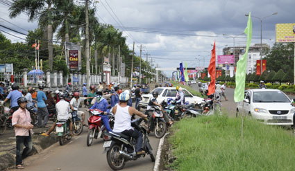 Chiếc xe 56K 2810 lật giữa đường, bị bể bánh trước bên phải, khiến xe ô tô đi qua khu vực này rất khó khăn. Rất đông người đi đường cả đi xe máy và ô tô dừng lại xúm đến xem càng làm cho lưu thông khó hơn.