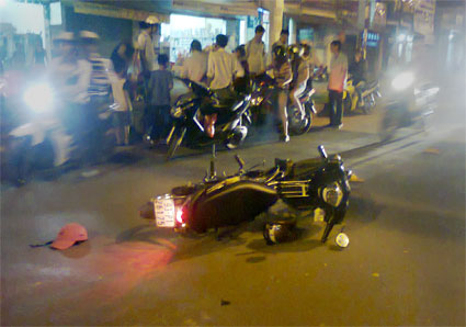 Khoảng 21 giờ 15 phút ngày 10-2 (ngày 1 tết âm lịch), anh Bùi Thanh Hải (phường Tân Xuân, TX. Đồng Xoài) đi xe máy biển số 93T9-3344 chở vợ và con gái đi chúc tết. Tới gần ngã tư Đồng Xoài, anh Hải bị xe máy 93P1-261.75 do một thanh niên xỉn rượu tông vào khiến thanh niên này phải nhập viện.