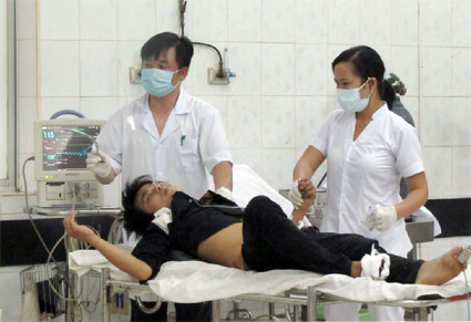 Nạn nhân Tô Văn Hoàng đang được bác sĩ sơ cấp cứu