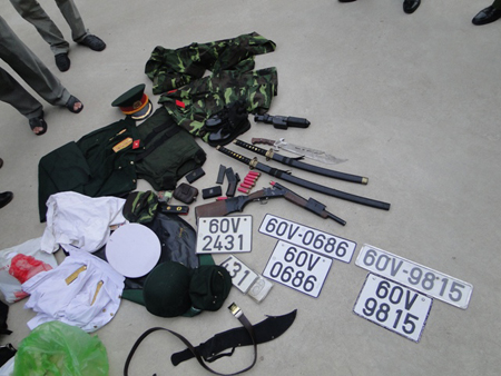 Tiến hành khám xét nơi ở của Điệp, cơ quan công an phát hiện, thu giữ 01 khẩu súng ngắn (loại bắn đạn bi); 01 xe ô tô loại 7 chỗ mang biển số 60V - 8598; 01 xe mô tô mang biển số 60L8 - 5354; 02 bộ quần áo, hai mũ sỹ quan quân đội cùng cấp hàm trung úy và thượng úy; 01 súng kíp hoa cải; 1 băng đạn bi, hai thanh kiếm; 01 mã tấu; 07 viên đạn chùm; 8 roi điện; 2 dụng cụ kích điện; 1 khẩu súng điện cùng nhiều loại giấy tờ giả khác.