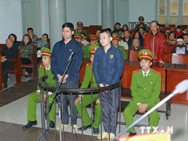Cảnh sát dẫn giải bị cáo Nguyễn Mạnh Tường (phía trước) và Đào Quang Khánh (phía sau) vào phòng xét xử