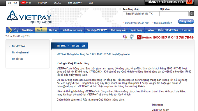 Website Công ty Vietpay ghi “tổng đài chăm sóc khách hàng 19001517 đã hoạt động trở lại từ 17g ngày 17-10-2013”, tuy nhiên chiều 22-1 gọi đến số máy này thì được thông báo “hệ thống bán hàng Vietpay vẫn trong quá trình sửa chữa và nâng cấp, chưa thể hoạt động trở lại...” - Ảnh chụp website Vietpay