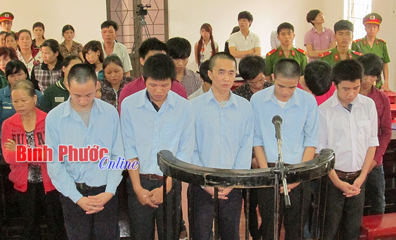 Các bị cáo bị đưa ra xét xử gồm: Nguyễn Hoàng Nam, 24 tuổi (đã có 3 tiền án về tội trộm cắp tài sản vừa mới ra tù), Nguyễn Quốc Việt 19 tuổi, Lê Anh Tuấn 20 tuổi, Tô Minh Hoàng 19 tuổi, Hoàng Văn Hùng 21 tuổi, Hoàng Văn Huy 18 tuổi, Lương Quyền Du 18 tuổi, Nông Tiến Hữu 17 tuổi, Hoàng Phúc Nguyên 17 tuổi, Hoàng Văn Dương 18 tuổi, Trần Đại Nghĩa 17 tuổi, đều có hộ khẩu thường trú tại thị xã Đồng Xoài và huyện Đồng Phú.