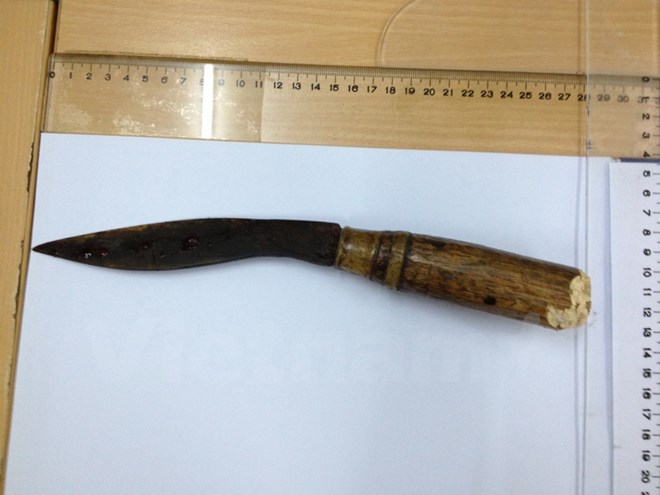 Ngay sau đó, bệnh viện tiến hành truyền dịch, chụp X-quang, CT scan để đánh giá các tổn thương. Kết quả CT scan cho thấy, lưỡi dao dài 10cm đâm từ hốc mắt bên trái xuyên qua sọ não kéo dài đến đỉnh sọ bên phải và có thể nhìn thấy phần lưỡi dao đâm ló ra bên ngoài.