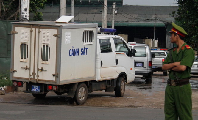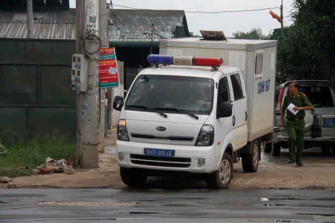 Hai chiếc xe bít bùng của cảnh sát chở hai bị can Nguyễn Hải Dương và Vũ Văn Tiến đến hiện trường vụ án thảm sát tại xã Minh Hưng, huyện Chơn Thành, tỉnh Bình Phước.