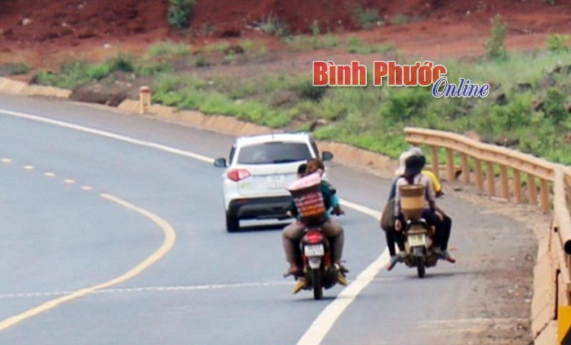 Người điều khiển xe máy một tay, không đội mũ bảo hiểm, chở theo trẻ em, coi thường tính mạng bản thân và mọi người. Ảnh chụp trên đường ĐT759, đoạn qua thôn Bàu Đỉa, xã Phước Tân (Phú Riềng).