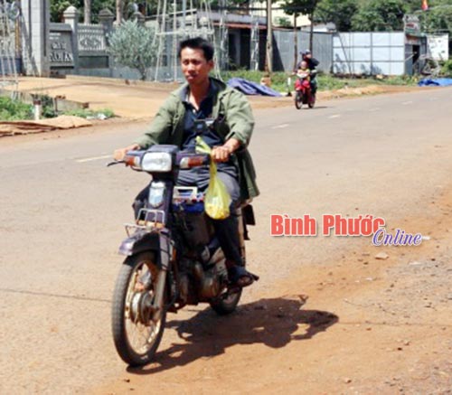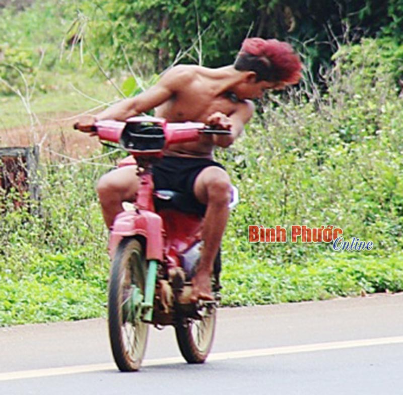Một thanh niên điều khiển xe máy cũ nát, chạy tốc độ cao gây nguy hiểm cho người tham gia giao thông. Ảnh chụp trên quốc lộ 14 đoạn qua xã Thọ Sơn (Bù Đăng).