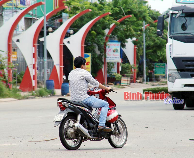 Mặc dù có mũ bảo hiểm treo trên xe nhưng người thanh niên điều khiển xe máy vẫn không chịu đội. Ảnh chụp trước cổng Khu công nghiệp Minh Hưng III (Chơn Thành).