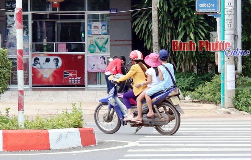 Người điều khiển xe máy không gạt chân chống, chở 3, trẻ em ngồi sau không đội mũ bảo hiểm. Ảnh chụp tại ngã tư quốc lộ 14 giao với đường Nguyễn Chánh (Đồng Xoài).