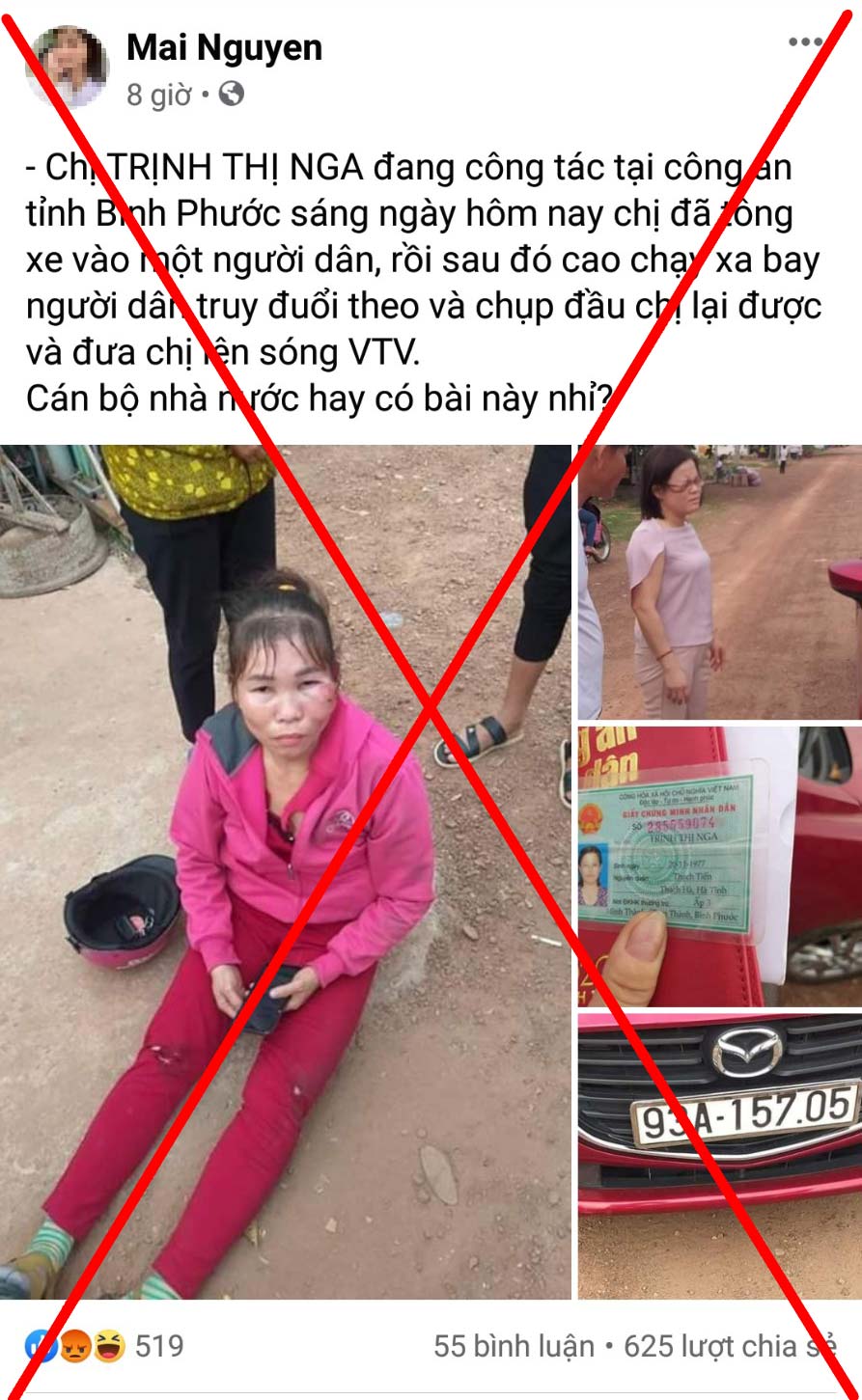 Khi qua đoạn thuộc ấp 2, xã Tân Thành, TP. Đồng Xoài thì bất ngờ xảy ra va quẹt với xe máy mang biển kiểm soát 20K1-528.35 do chị Tuyền, ngụ H. Chơn Thành, tỉnh Bình Phước điều khiển lưu thông cùng chiều. Do va quẹt nhẹ, chị Nga đã không biết vụ việc nên tiếp tục điều khiển xe ô tô đi tiếp về hướng H. Chơn Thành. Đi được khoảng 500m thì có 2 thanh niên (không rõ lai lịch) điều khiển xe máy từ phía sau lên ra hiệu dừng xe và thông báo xe chị có va chạm giao thông với xe máy phía sau, lúc này chị Nga mới biết sự việc và nhanh chóng quay lại. Hai bên đã cùng giải quyết vụ việc trên tinh thần thấu hiểu và chia sẻ. Chị Nga cho biết, do va chạm quá nhẹ chị đã không hay biết, không phải chị bỏ chạy khi gây ra lỗi. "Lương tâm con người, hình ảnh người công an nhân dân không được như vậy. Hơn nữa, đây là phụ nữ với nhau, không có chuyện chị biết mình gây tai nạn với chị em cùng phái yếu với nhau mà bỏ chạy", chị Nga khẳng định.