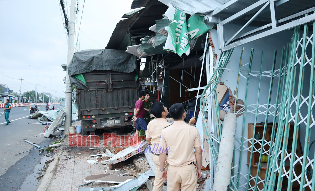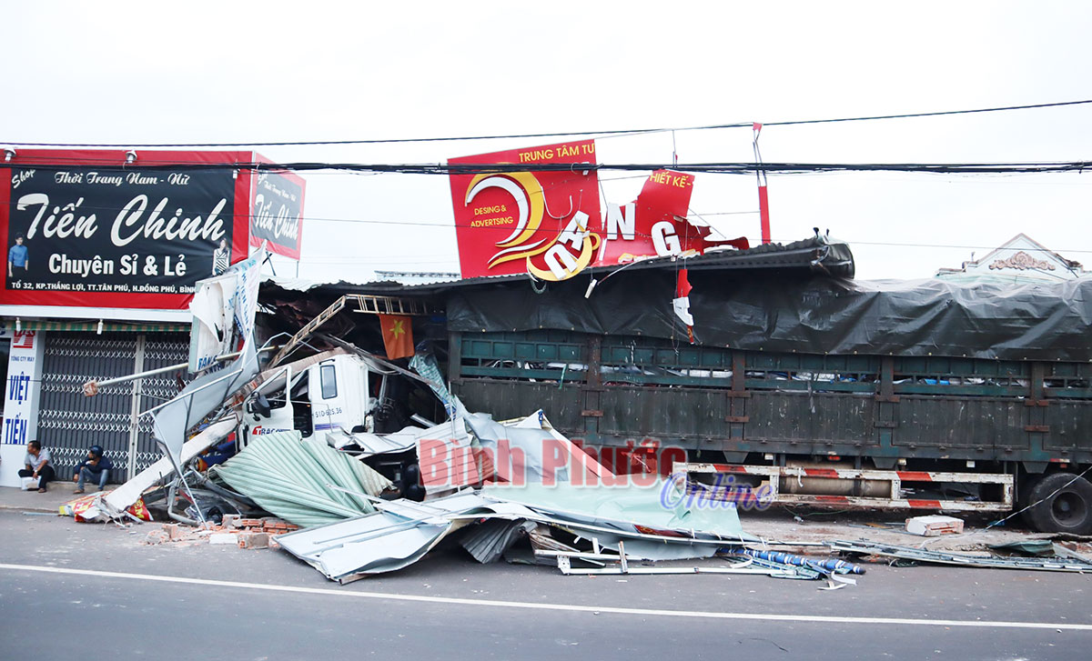 Khi qua tổ 30, khu phố Thắng Lợi, thị trấn Tân Phú, huyện Đồng Phú, tỉnh Bình Phước, tài xế xe container bất ngờ mất lái lao xe qua lề đường bên phải, tông liên hoàn vào nhiều bảng hiệu, cột điện, tường, mái hiên của nhà dân.