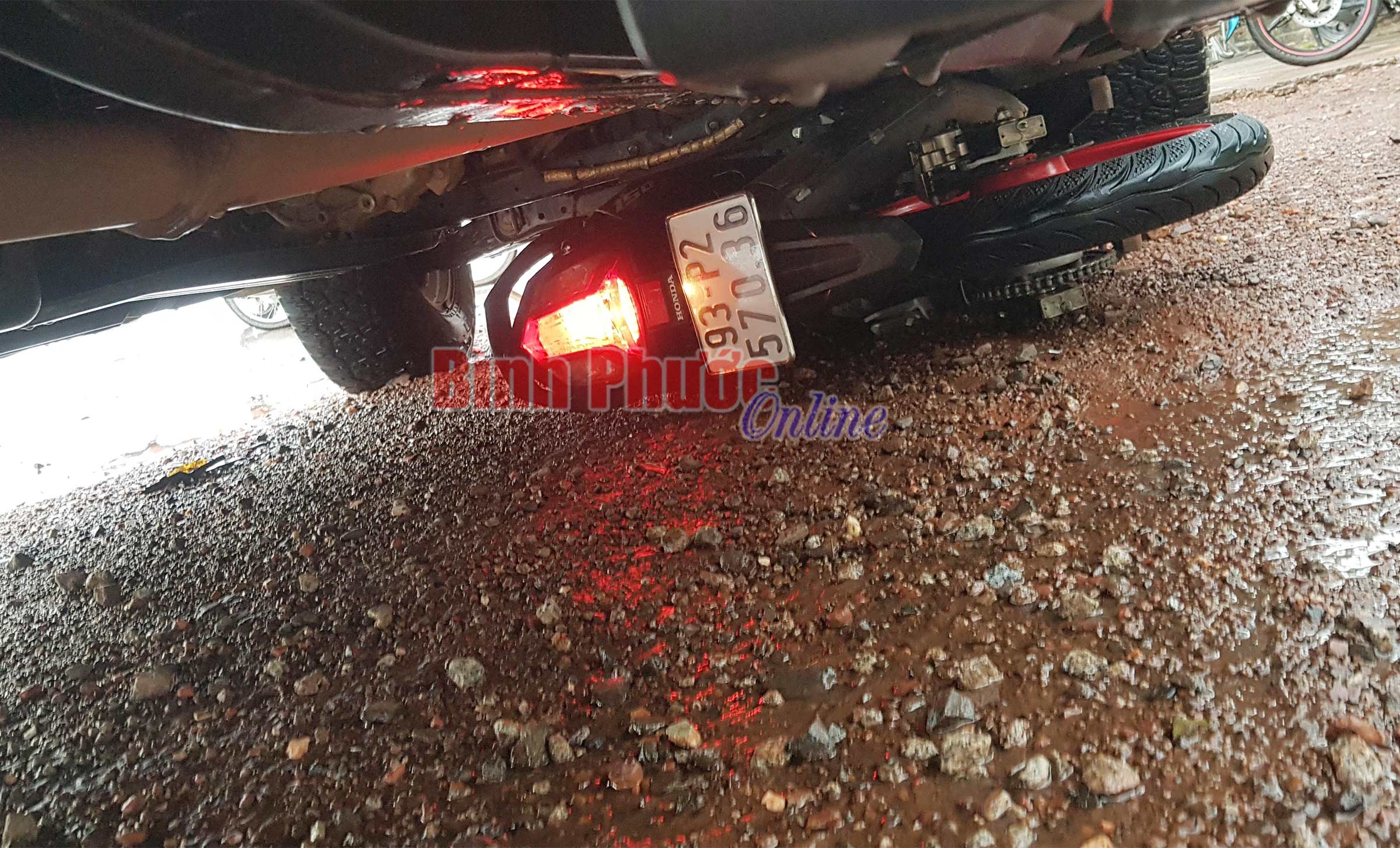 Chiếc xe máy bị cuốn vào gầm xe ô tô bán tải