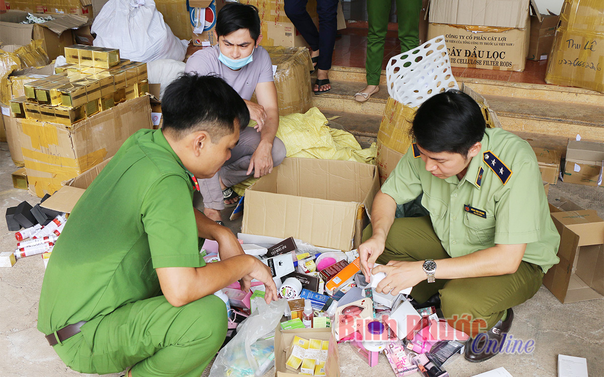 Công an TP. Đồng Xoài phối hợp với lực lượng quản lý thị trường tỉnh Bình Phước tiến hành kiểm đếm số hàng hóa