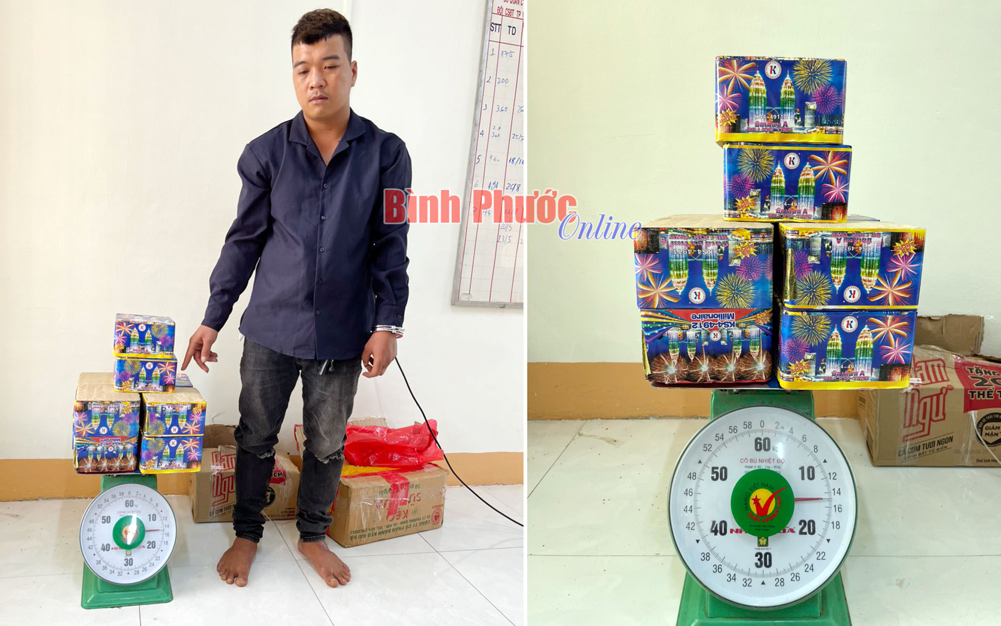 Qua kiểm tra đã phát hiện Đức chở trên xe mô tô 10 khối hộp chữ nhật, phía bên ngoài mỗi hộp chữ nhật in nhiều màu sắc, nhãn mác có in chữ nước ngoài, tổng trọng lượng là 14,8kg. Nguyễn Công Đức khai nhận là pháo.