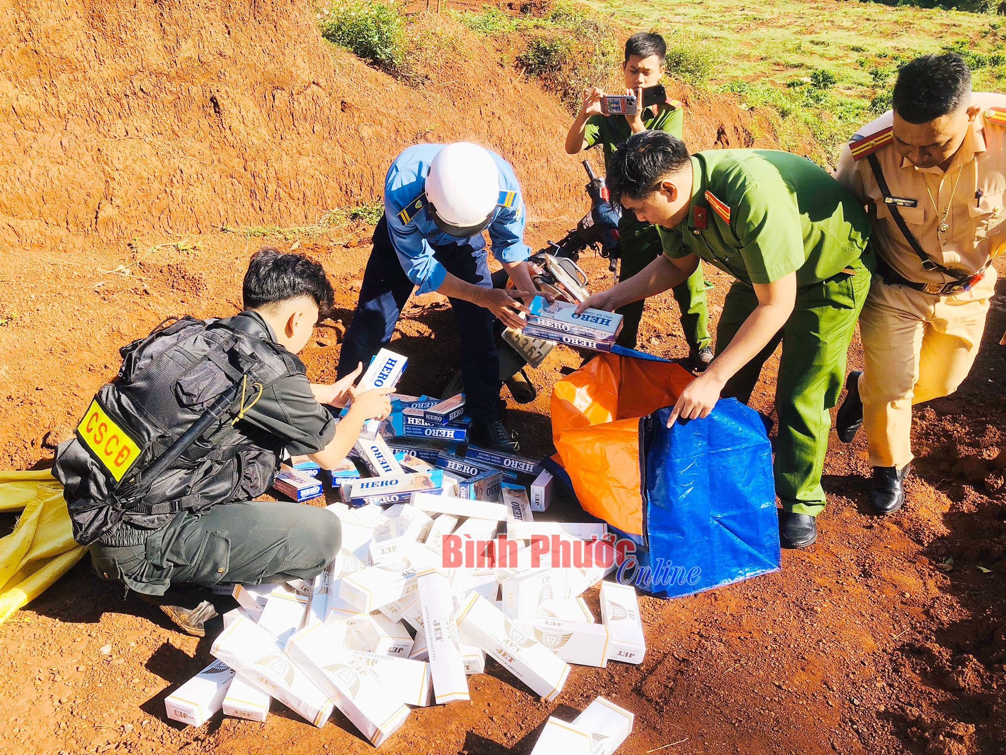 Chiếc xe mô tô đối tượng để lại có biển số 93P1-235.67. Thùng hàng bên trong chứa 100 cây thuốc lá, gồm 50 cây hiệu Jet và 50 cây hiệu Hero. Cơ quan chức năng đã lập biên bản, xử lý vụ việc theo quy định của pháp luật.