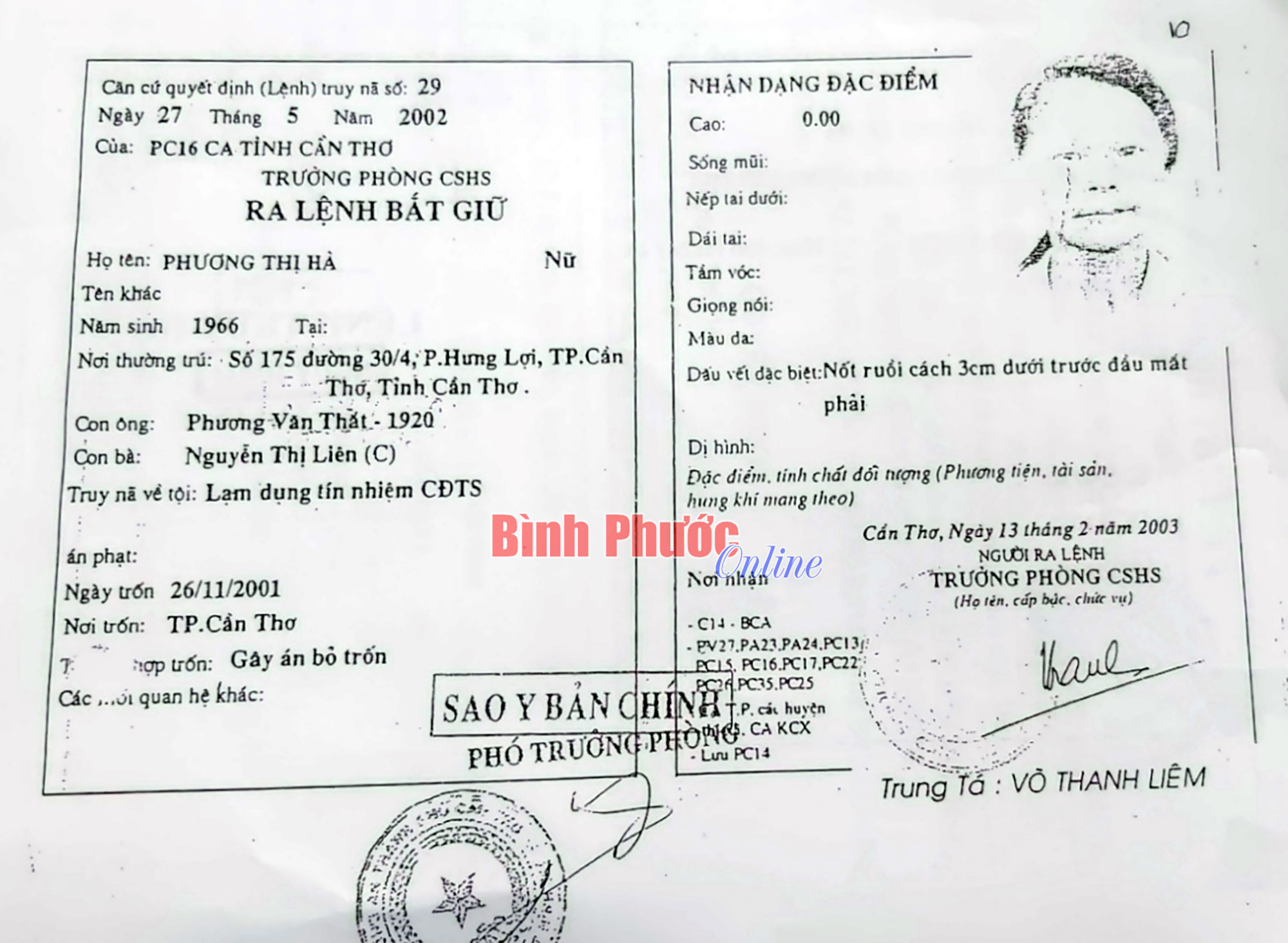 Lệnh bắt giữ Phương Thị Hà năm 2003 và đối tượng Phương Thị Hà khi bị bắt giữ