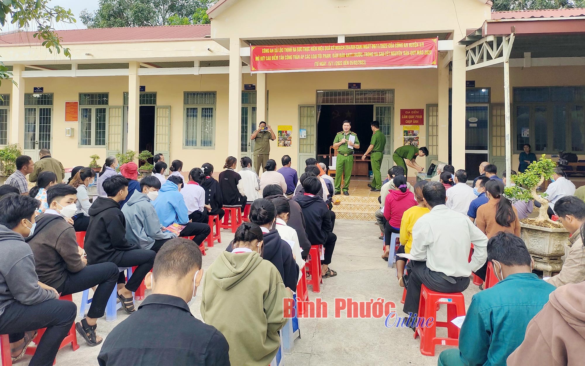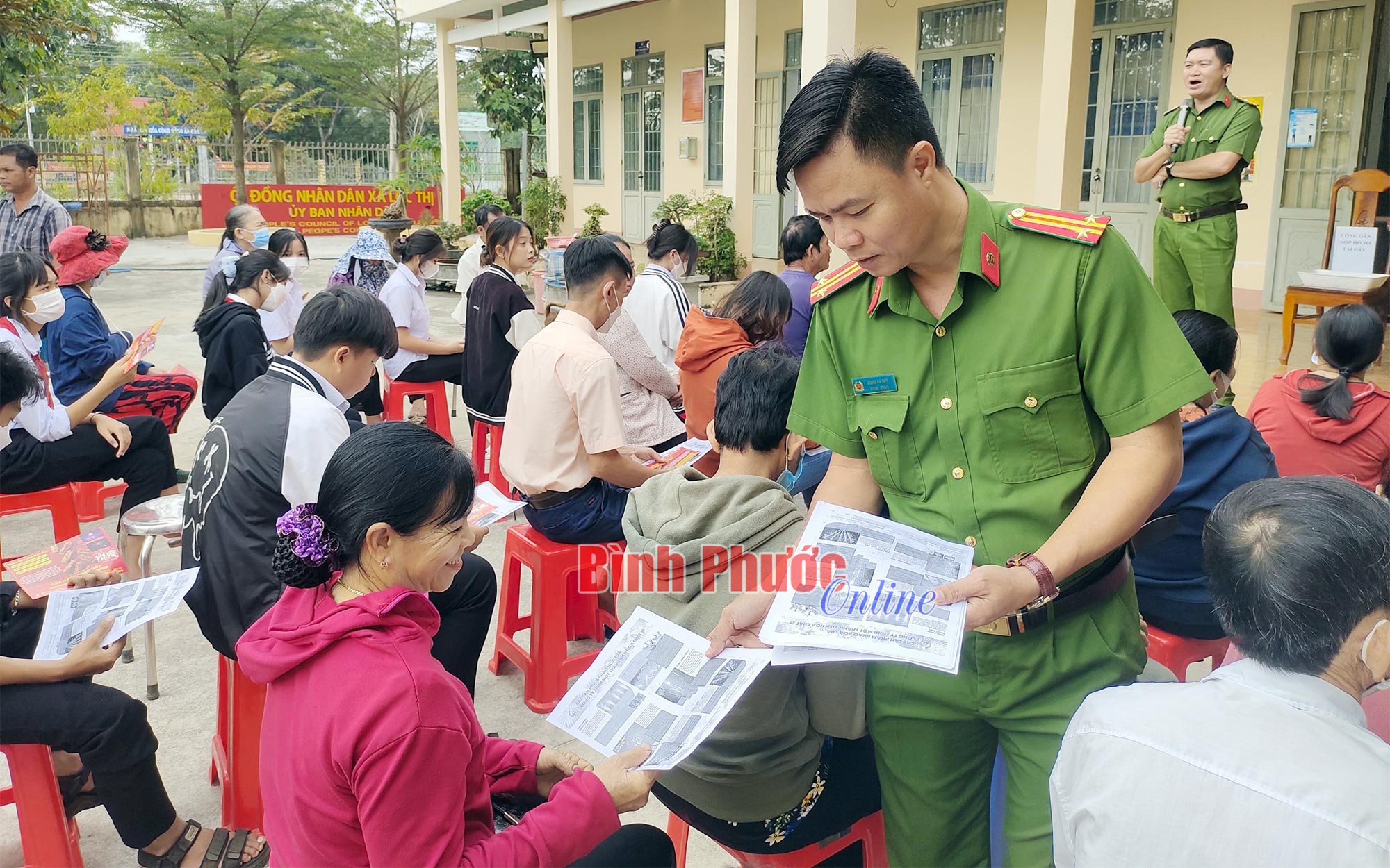 Cán bộ công an tuyên truyền pháp luật về VK, VLN, CCHT và pháo, đồng thời phát tờ rơi cho nhân dân, học sinh tại xã Lộc Thịnh, huyện Lộc Ninh