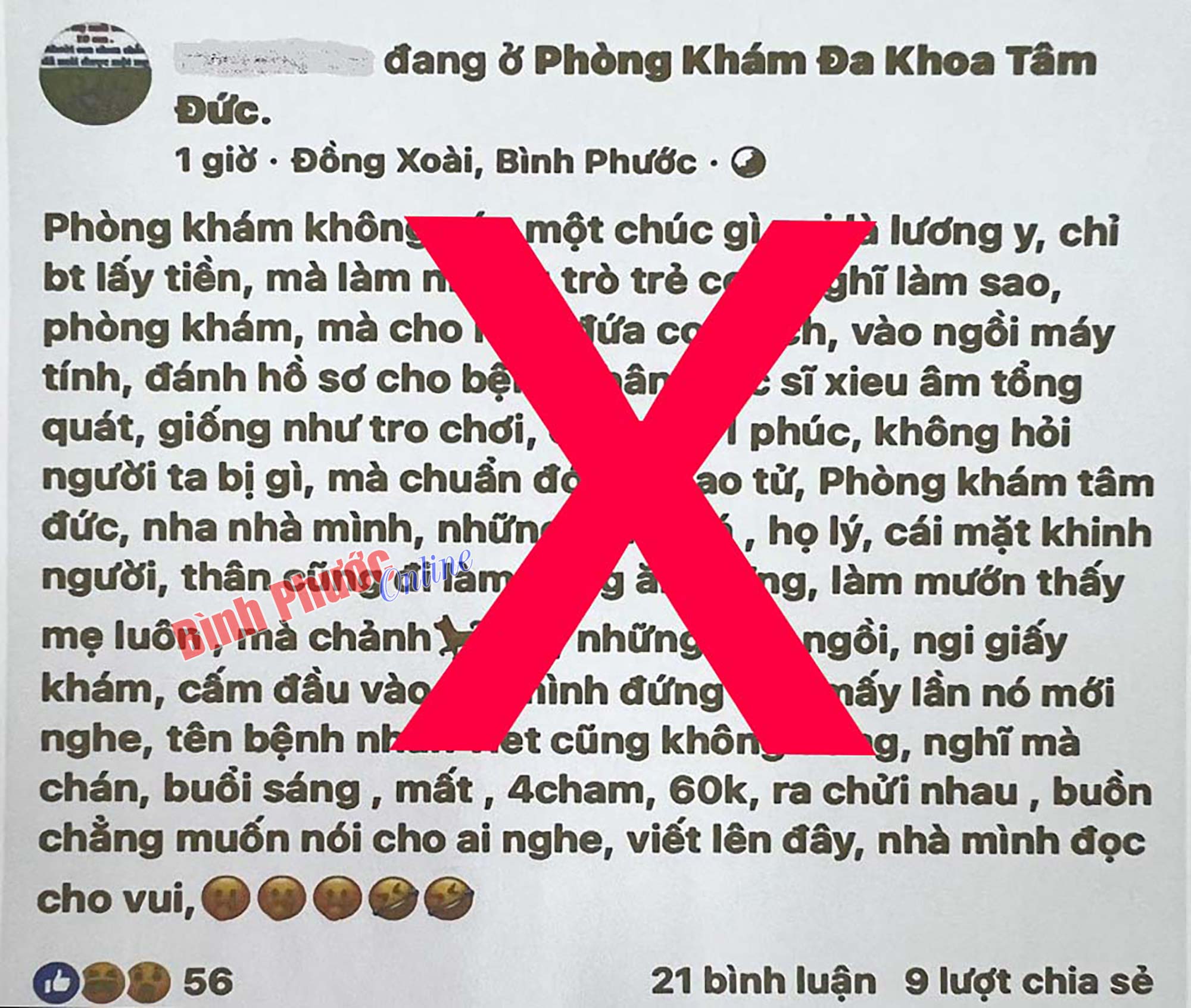 Làm việc với cơ quan công an, bà N.T.T khai nhận: Khoảng 8 giờ ngày 27-5-2022 có đến Phòng khám đa khoa Tâm Đức để khám bệnh. Khi được bác sĩ siêu âm cho biết là bị rối loạn tiêu hóa dẫn đến đau bao tử thì bà N.T.T tự ý bỏ về. Mặc dù, đại diện phòng khám đã liên hệ bà N.T.T để trả kết quả khám bệnh nhưng bà N.T.T đã từ chối mà không cho biết lý do. Đến khoảng 12 giờ cùng ngày, bà N.T.T sử dụng tài khoản facebook “Thanh Tu” đăng tải nhiều nội dung bịa đặt, sai sự thật nhằm giải tỏa tâm trạng buồn bực của bản thân, chỉ để cho vui.