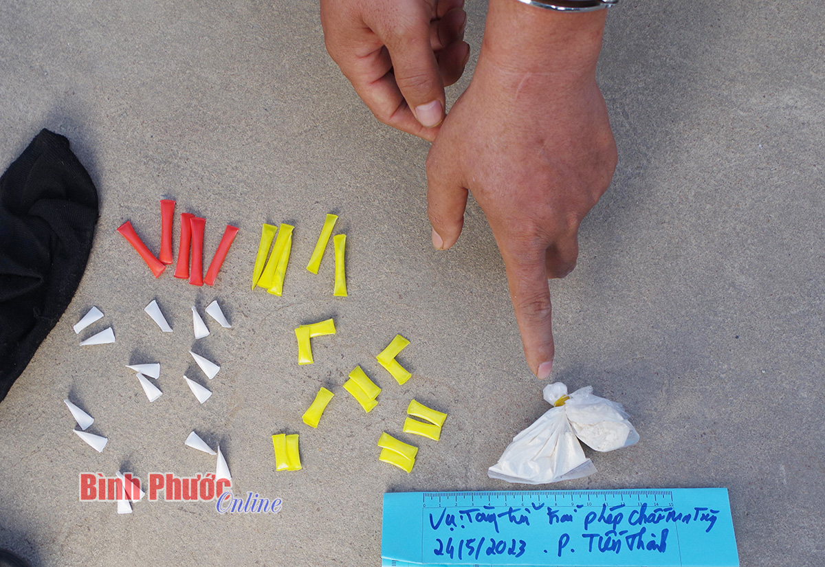Qua kiểm tra phát hiện, trên ba ga xe môtô biển số 51T3-7680 của Phương có 1 tất vải màu đen, bên trong có 39 đoạn ống hút các loại chứa chất màu trắng và 2 bịch ni-lon cột dây thun đều chứa chất màu trắng.