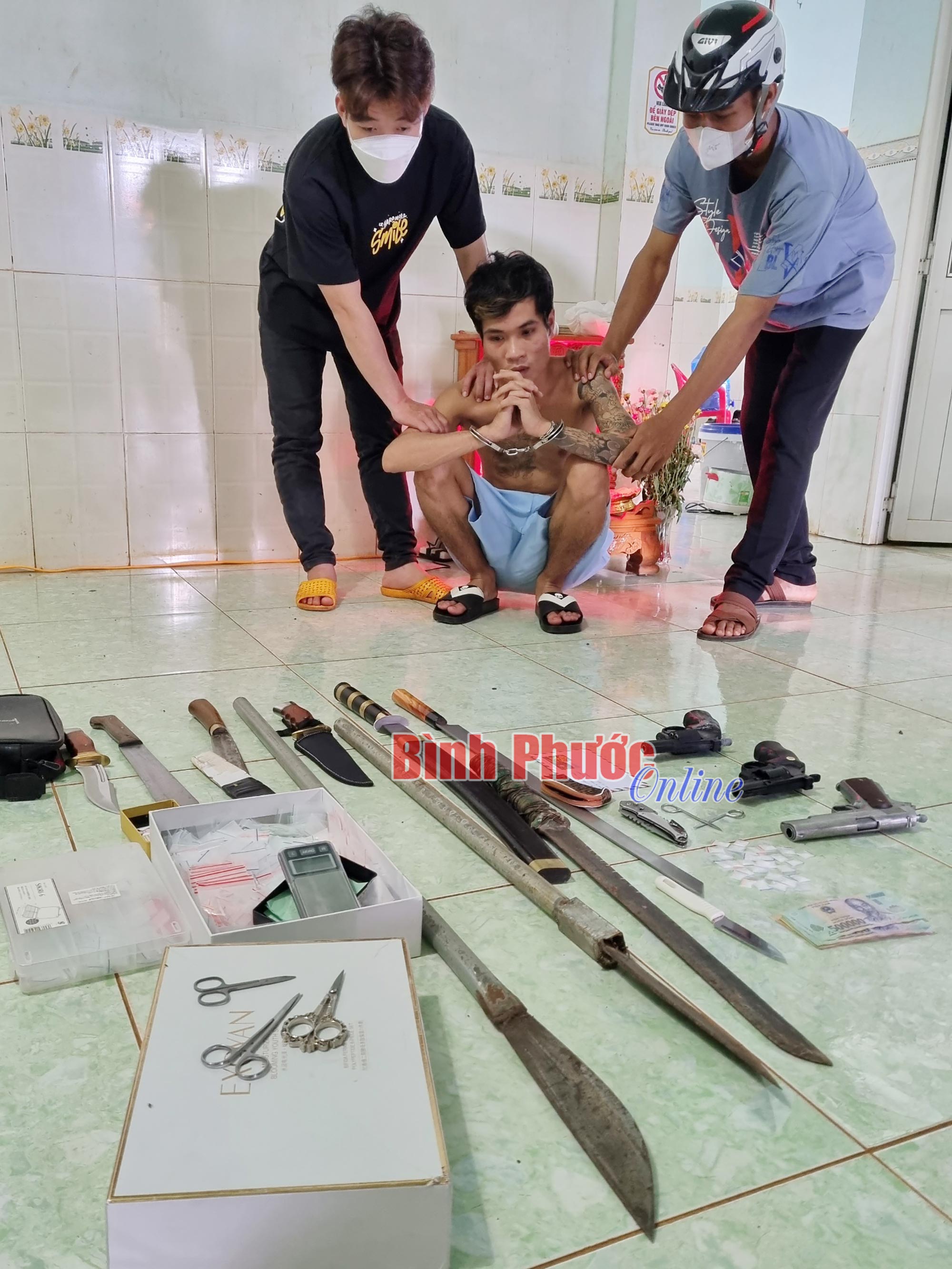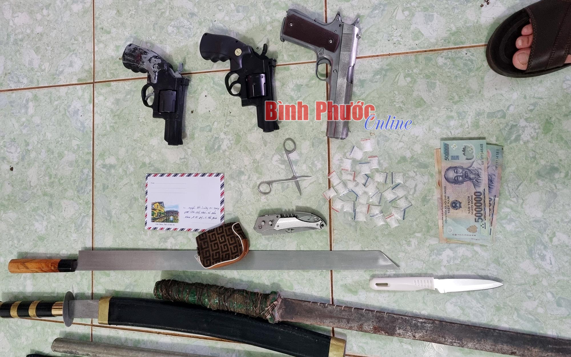 Trước đó vào khoảng 13 giờ 30 phút ngày 8-8-2023, tại thôn Đắk Xuyên, xã Đắk Nhau, huyện Bù Đăng, Đội cảnh sát điều tra tội phạm về ma túy, Công an huyện Bù Đăng phối hợp với Công an xã Đắk Nhau bắt quả tang 3 đối tượng trên đang có các hành vi mua bán trái phép chất ma túy và tàng trữ trái phép chất ma túy. Tang vật thu giữ gồm: 31 gói ni-lon, bên trong có chứa chất tinh thể màu trắng, các đối tượng khai là ma túy tổng hợp; 1 bộ dụng cụ để sử dụng ma túy; 1 cân tiểu li, 6 điện thoại di động các loại, 3 khẩu súng ngắn và nhiều hung khí nguy hiểm, cùng số tiền 3,4 triệu đồng.