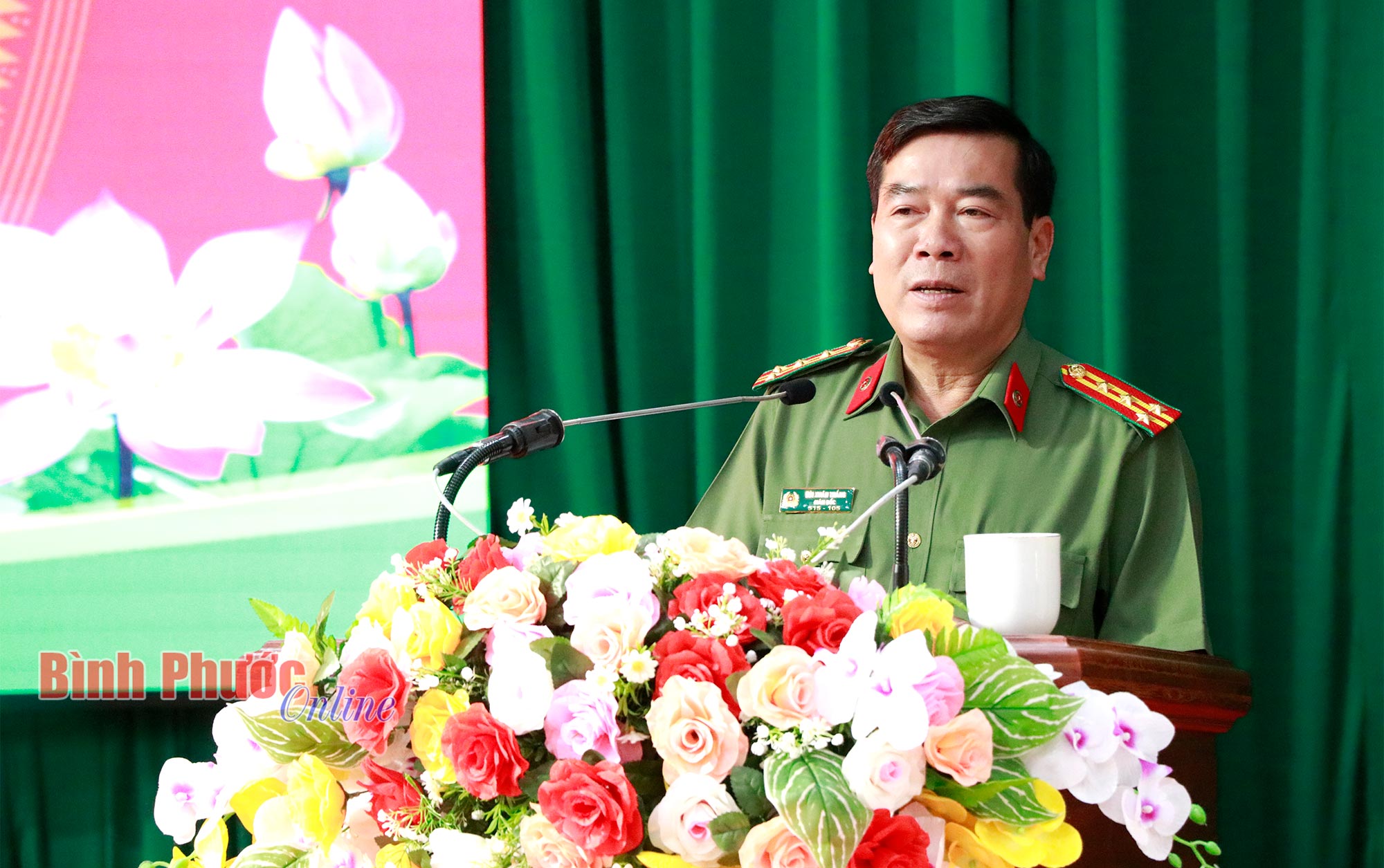 Đại tá Bùi Xuân Thắng, Ủy viên Ban Thường vụ Tỉnh ủy, Bí thư Đảng ủy, Giám đốc Công an tỉnh Bình Phước phát biểu khai mạc hội nghị