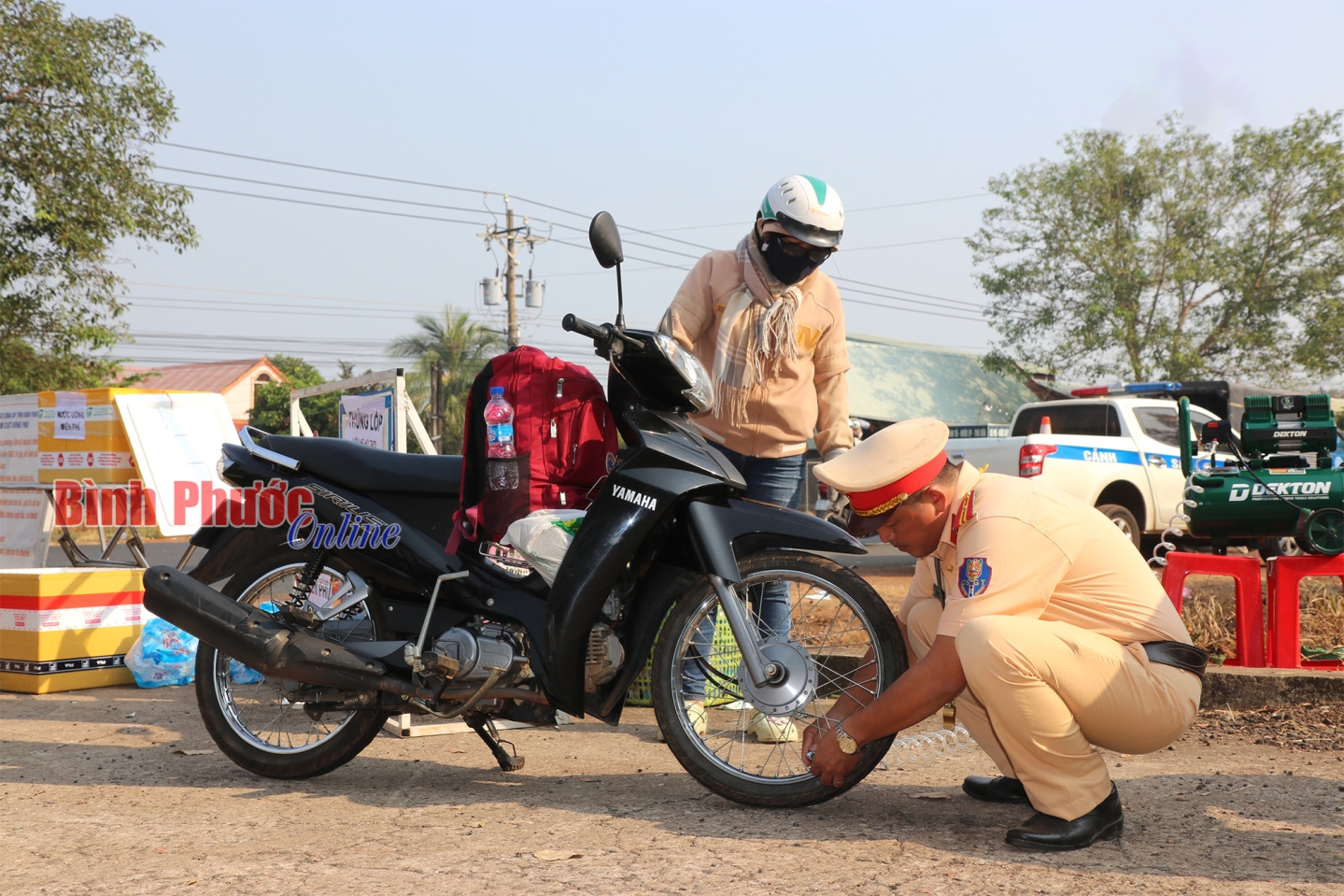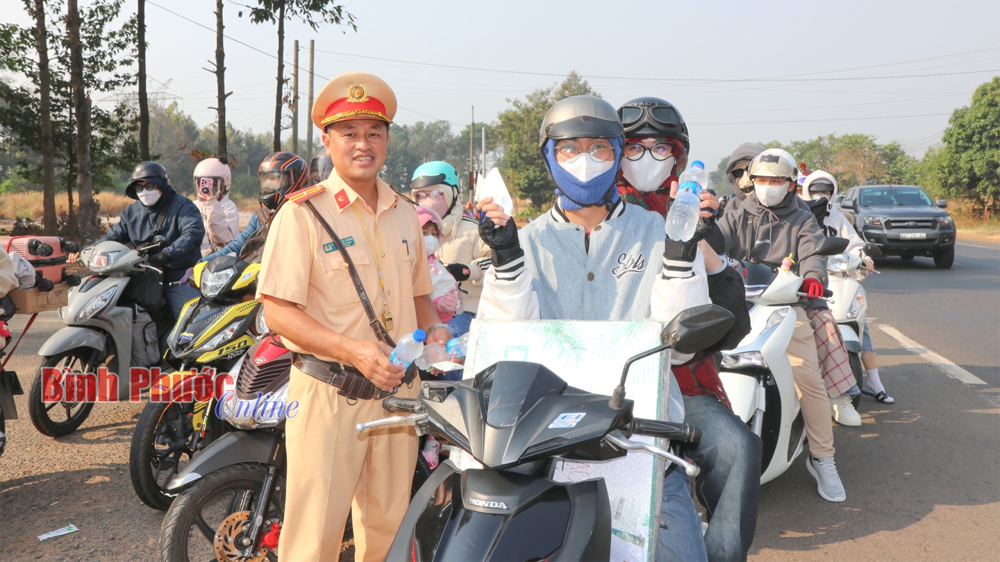 Thiếu tá Phạm Quốc Cường, Phó Trạm trưởng Trạm CSGT Đồng Phú cho biết: “Năm nay, ngoài tặng hàng ngàn chai nước mát kèm khăn lạnh, chúng tôi còn mua máy bơm và dụng cụ vá xe để nếu có trường hợp nào bị thủng bánh, sẽ hỗ trợ kịp thời. Chúng tôi ghi rõ số điện thoại của chỉ huy trạm, để bà con biết, nếu cần hỗ trợ sẽ gọi. Trường hợp gặp sự cố ở các địa điểm trên tuyến quốc lộ 14 thuộc địa bàn tỉnh Bình Phước, chúng tôi sẽ có giải pháp giúp bà con ngay. Bởi thực tế những ngày cuối năm, cận tết, nhiều cơ sở sửa chữa môtô, xe máy đóng cửa. Nếu bà con gặp sự cố, đặc biệt trong đêm khuya sẽ rất khó để xoay sở”.