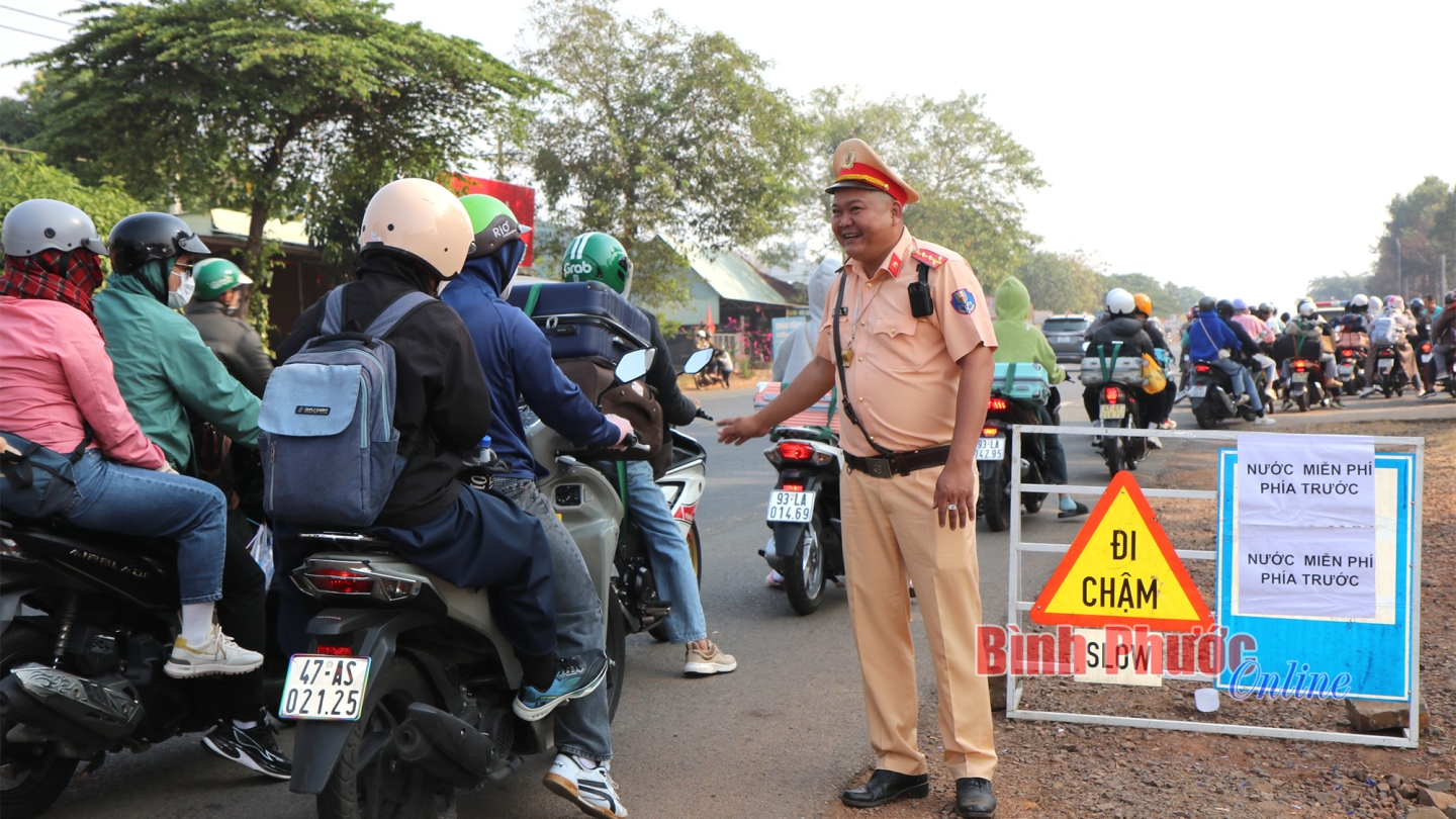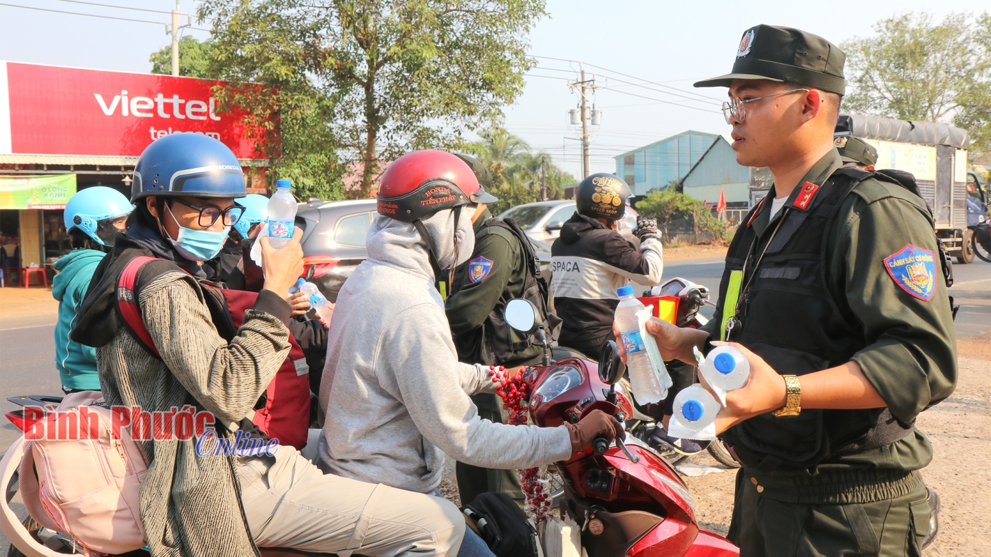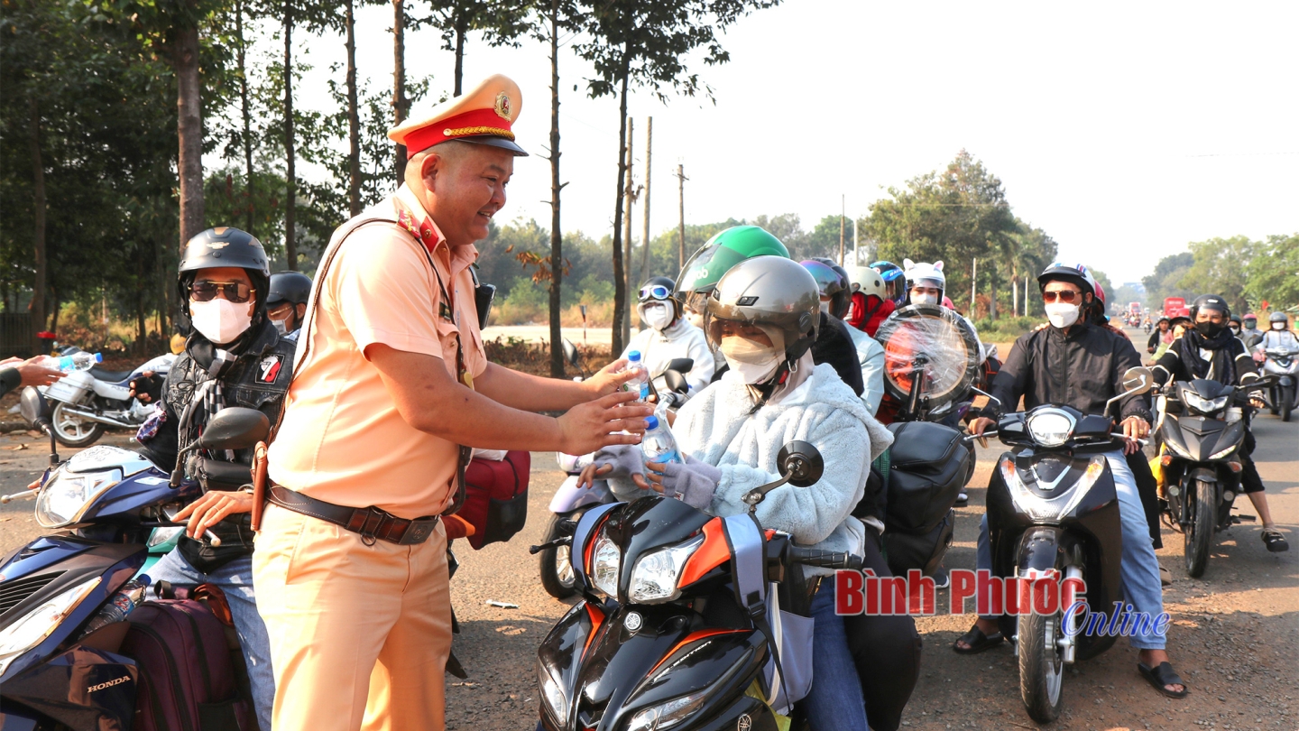 Cùng với các hoạt động ý nghĩa trên, lực lượng CSGT tỉnh Bình Phước còn tuyên truyền bà con thực hiện tốt Luật Trật tự an toàn giao thông, không phóng nhanh, vượt ẩu để mỗi hành trình di chuyển đều được an toàn.