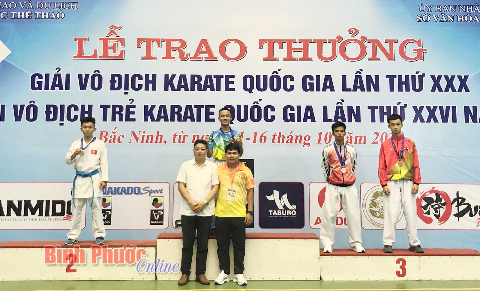 Vận động viên Nguyễn Thái Duy giành HCV hạng cân 50 kgỞ trận chung kết tranh HCV hạng cân 50kg nam, bằng sự bản lĩnh, tự tin, vận động viên Nguyễn Thái Duy đã xuất sắc vượt qua đối thủ đội Bình Dương và giành được HCV. Đây là tấm HCV đầu tiên của đoàn Bình Phước tại Giải vô địch Karate quốc gia sau nhiều năm chờ đợi.